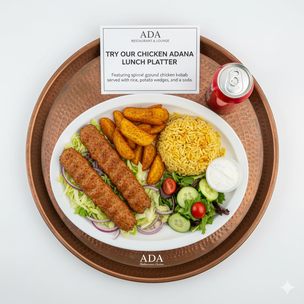 Try our Chicken Adana Lunch Platter, featuring spiced ground chicken kebab served with rice, potato wedges, and a soda.