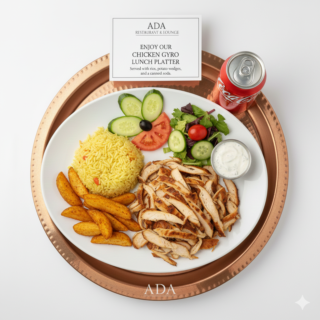 Enjoy our Chicken Gyro Lunch Platter served with rice, potato wedges, and a canned soda at Ada Mediterranean Cuisine Grill.
