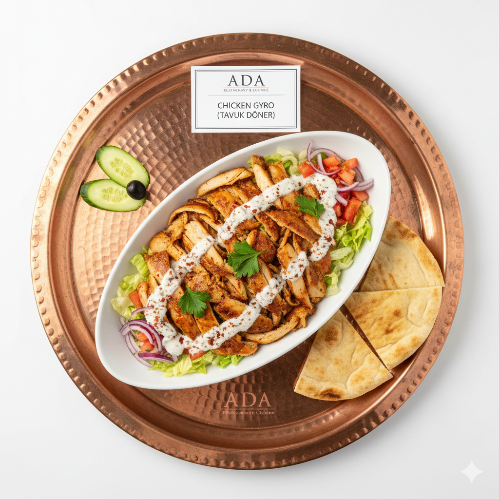 Try Tavuk Döner, thinly sliced chicken roasted on a vertical rotisserie, served fresh at Ada Mediterranean Cuisine Grill.